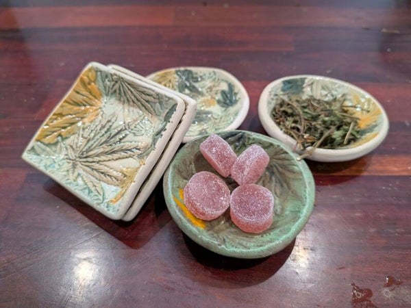 Need something smaller? This round dish is perfect for holding a edible or a roll. The stoneware is a mid-fire glaze with hand-painting and texture for surface design.